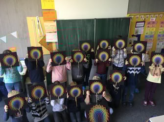 schlagen. Anschließend haben wir in den richtigen Farben einen Regenbogen aus Wolle um die Nägel gewickelt. Das war gar nicht so leicht und wir mussten mehrmals wieder aufwickeln und von vorne